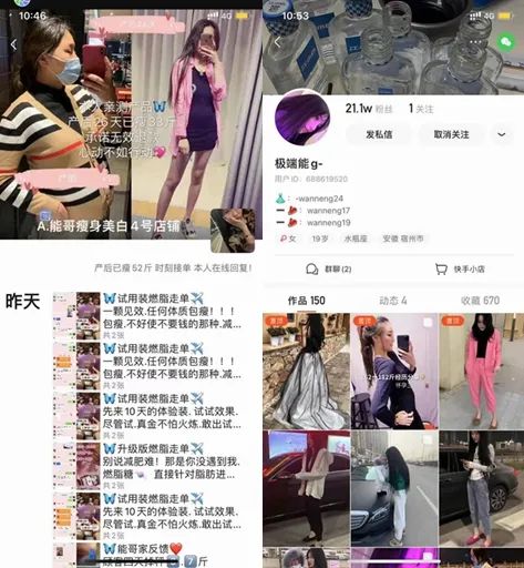 网红带货、快手平台售卖的减肥产品时刻挑逗着渴望减肥人群的神经:在微信朋友圈,经常收到微商广告:“本人亲测产品。产后26天瘦33斤,承诺无效退款;产后瘦52斤 时刻接单;试用装燃脂走单,一颗见效,任何体制包瘦”……一系列的虚假广告充斥着我们的生活中,影响着人们的健康,甚至危及生命。近日,市场监管总局公布了2021民生领域案件查办“铁拳”行动典型案例(第二批)。其中,安徽省铜陵市市场监管局查处葛某邹某等生产销售有毒有害食品案引起广泛关注。