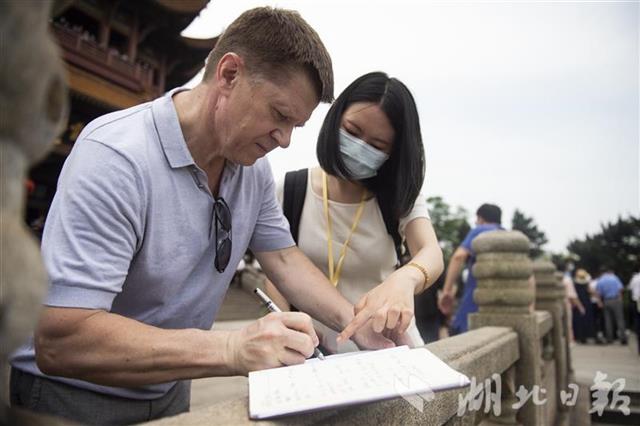 在黄鹤楼前,尤里·先科欣赏了太极表演,他说,这是他今年第二次来到湖北,城市街道一眼望去满目绿色,很有家乡的味道。