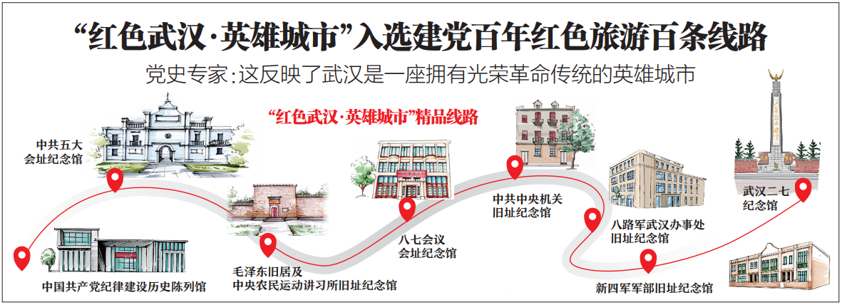 长江日报讯(记者万建辉)文化和旅游部、中央宣传部、中央党史和文献研究院、国家发展改革委5月31日发布公告,推出“建党百年红色旅游百条精品线路”,其中“红色武汉·英雄城市”精品线路入选。相关党史专家表示,这反映了武汉是一座拥有光荣革命传统的英雄城市。