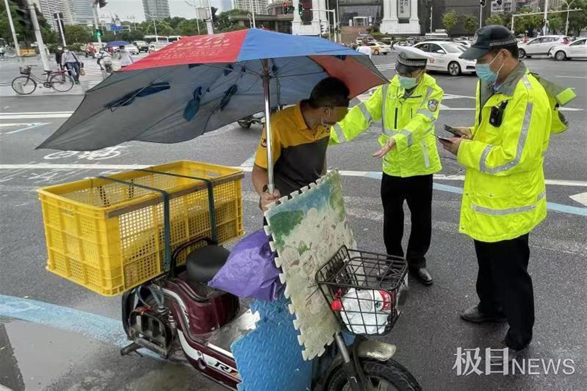 3日上午,风雨交加,9时许,一名快递小哥李某因电动车加装伞蓬被执勤交警拦停。武昌区交通大队民警吴安意当场对其进行了交通安全教育宣传,并依法对其处罚,李某当即配合执勤民警现场拆卸加装雨蓬。据现场民警介绍,在进行了相关法律法规宣传教育后,大多数电动车主积极主动配合拆除了加装伞蓬。