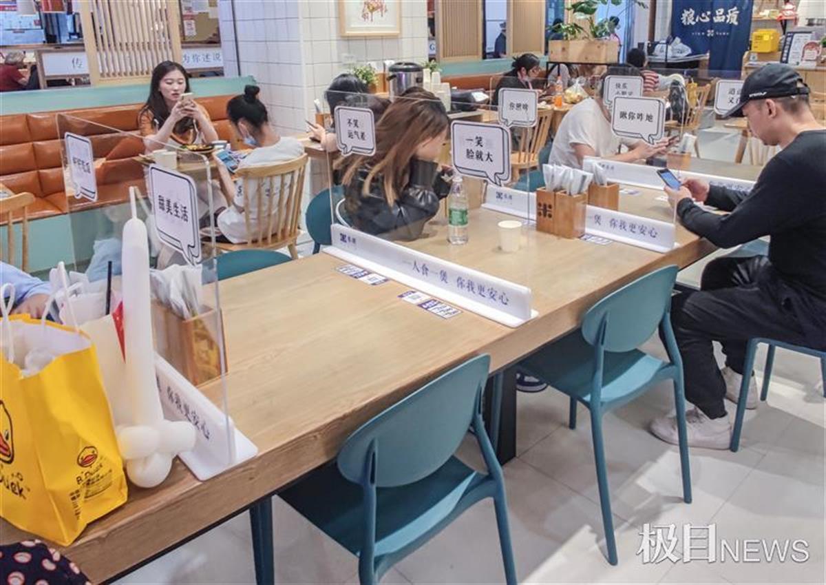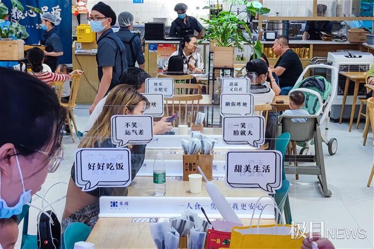 在现场,餐厅设有双人和多人桌,餐厅中间,有一排长桌专为单人用餐准备,桌上用透明的塑料隔板隔出了5个单人用餐空间,将座位隔成5个相对私密、独立的单人空间,当时有3个人各自落坐,另还有一家人就坐在桌边的空间用餐。