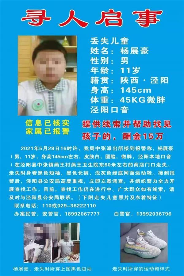 陕西咸阳11岁男孩走失近一周,家长悬赏15万寻子
