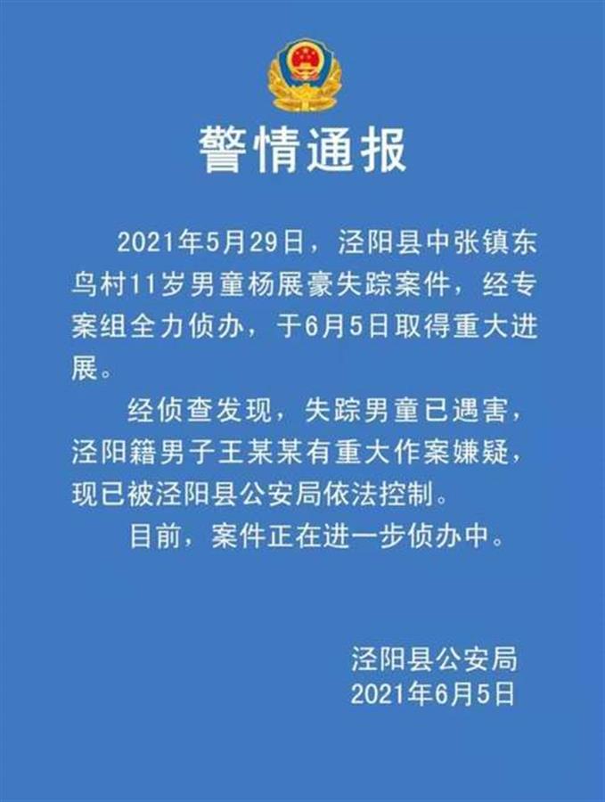 6月5日,泾阳县公安局发布警情通报称,5月29日,泾阳县中张镇东鸟村11岁男童杨展豪失踪后,经警方侦办发现,该男童已遇害,泾阳籍男子王某某有重大作案嫌疑,现已被警方控制。