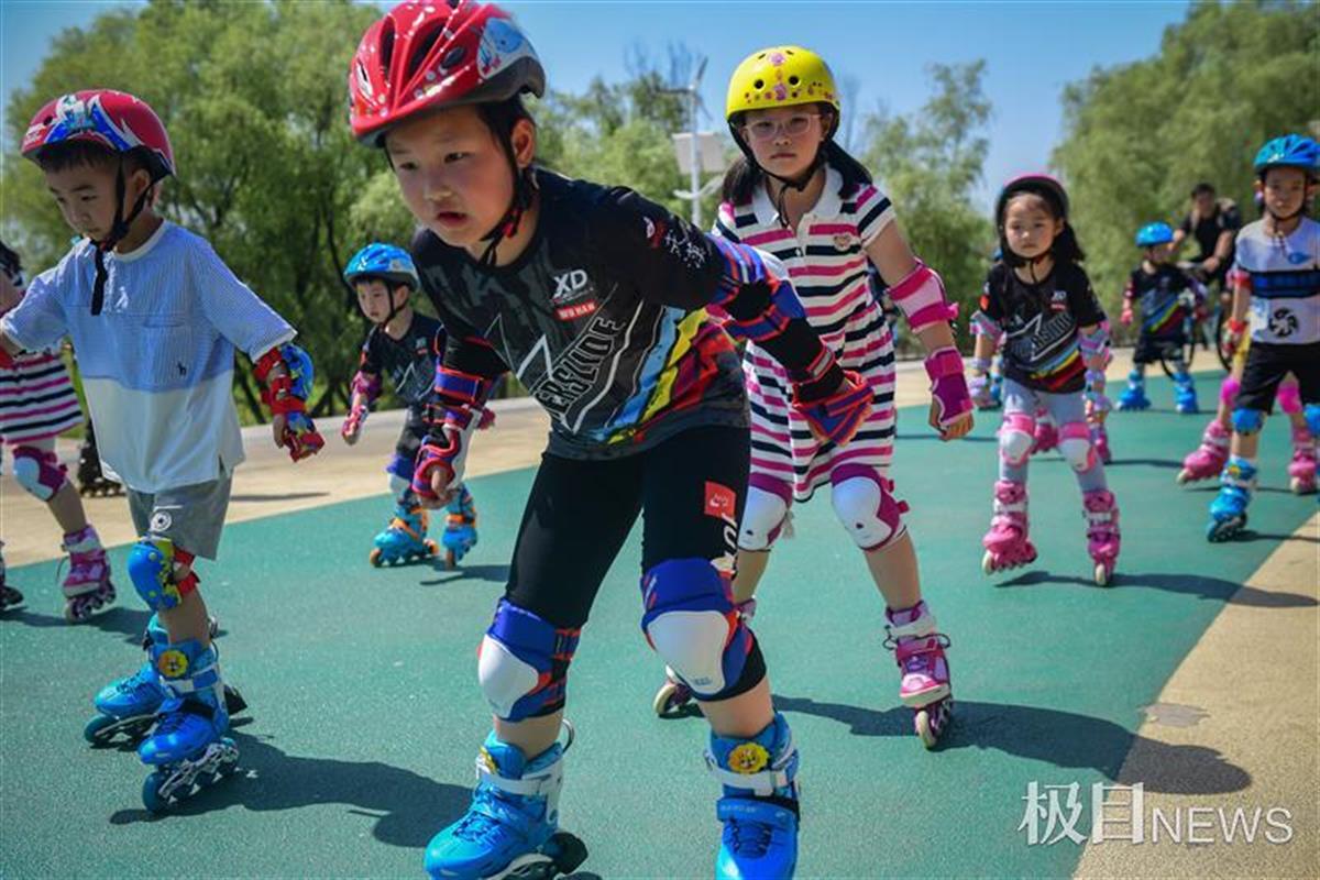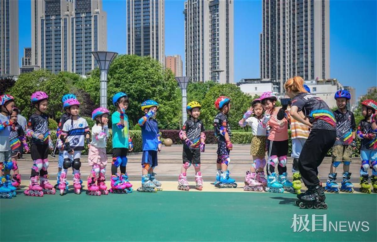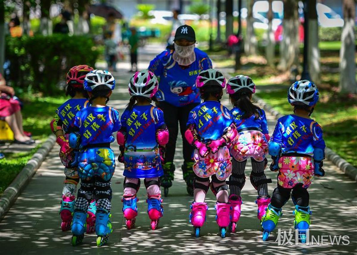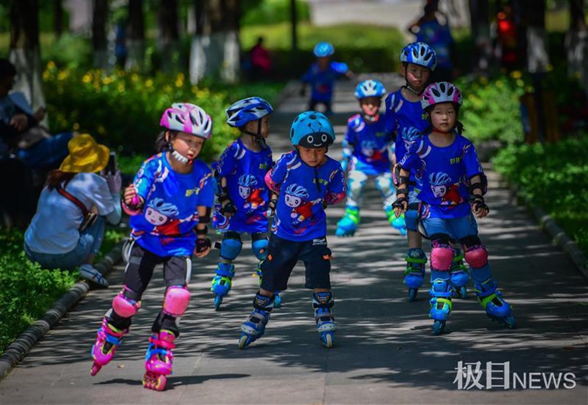 “大家快跟上,再滑十分钟就休息喝水,注意保持队形,转弯时小心摔跤……”教练扯开喉咙穿梭于队形中,不时提醒着轮滑小朋友。