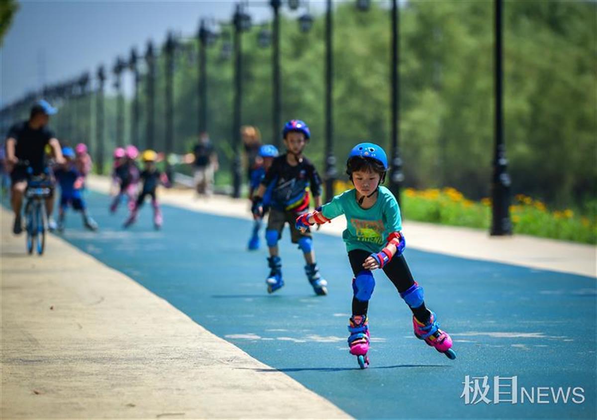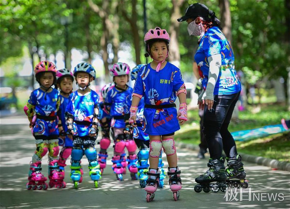 6月6日上午,武汉汉口江滩滨江公园内,全幅武装的小朋友们,在这里欢畅地滑着轮滑,以此方式欢度“6·6轮滑日”。