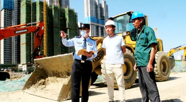 民警走进工地,吁请施工人员“静音”。通讯员董宏祥摄