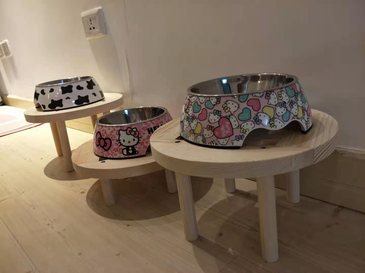 张莉家中养了三只小狗,伴随着狗狗一天天长大,她开始担心狗狗吃食物时低头,会患上颈椎病。于是,她特意定制三个小板凳,将碗放在板凳上,供狗狗吃食物时不再费力低头。
