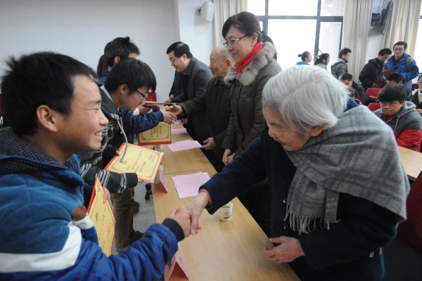 获得捐助的部分学生取得良好成绩,崔崑院士和夫人朱慧楠老人给学生颁发获奖证书。