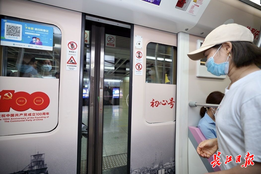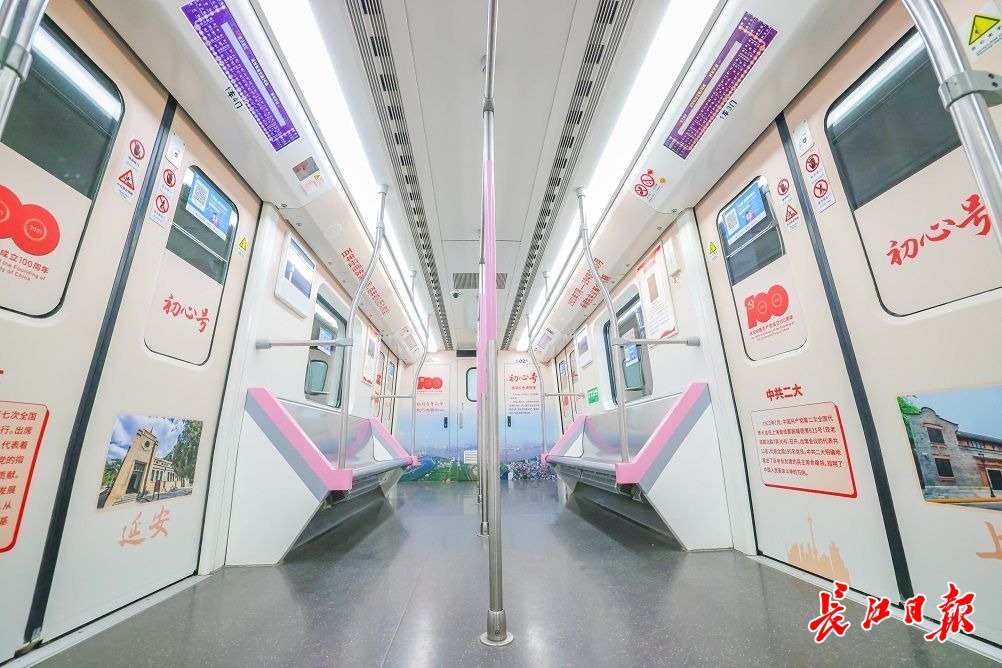 在洪山地铁站,记者搭乘了首发的2号线“初心号”红色专列。2号线是中国首条穿越长江的地铁,着重车厢内部设计,6节车厢图文并茂地回顾了中国共产党在武汉的百年光辉历程,具有很强的历史性、审美性、服务性、互动性。在2号线专列上,大家不仅可以了解中共一大至十九大的相关史实,还可以了解八七会议会址、中共五大会址等16个武汉著名红色旧址的历史地位和相关文物展陈信息,并通过一系列精美大气的照片,感受从上世纪50年代至今,在中国共产党领导下,武汉的沧桑巨变。