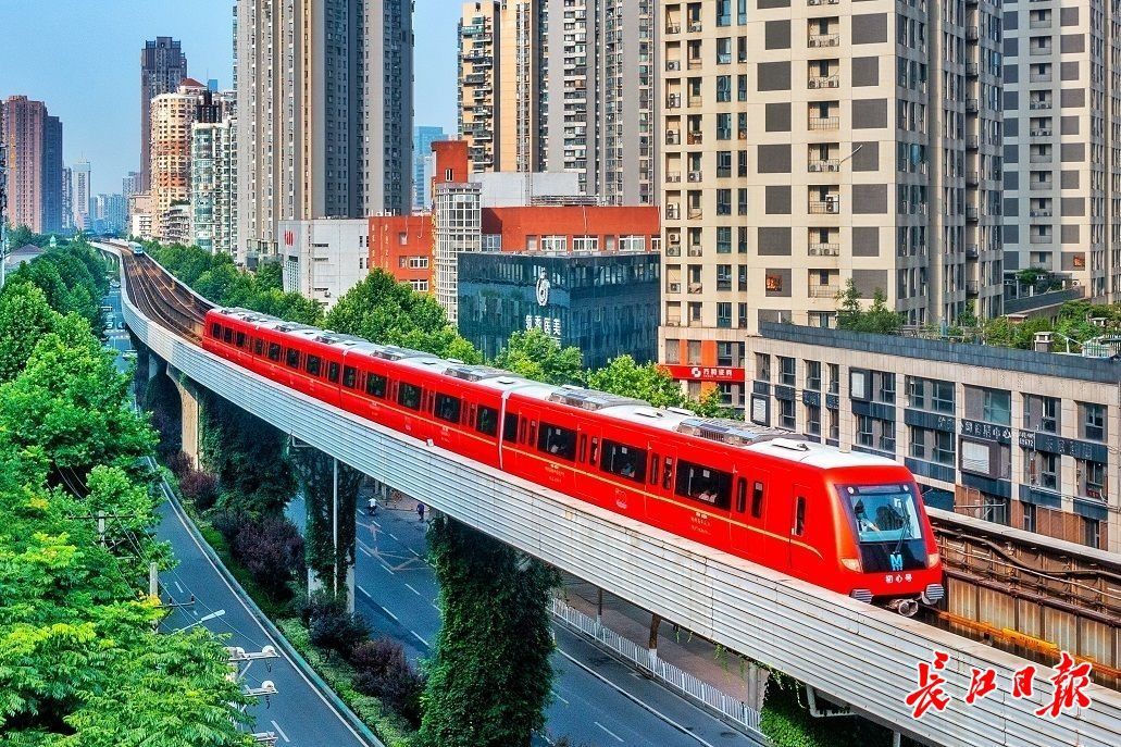 9日上午8时33分,首发的1号线“初心号”穿越城市上空。长江日报记者胡九思 摄