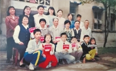 于植颜家珍藏的一张37门被评选为文明楼栋时12户居民一起拍的“全家福”。