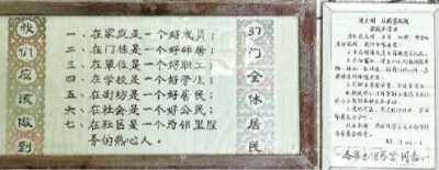 当时的62街居委会书记李少宏给每个获评的文明楼栋都写了他自创的文明公约,张贴前也得到了楼栋每户居民的认同。记者看到,37门的文明公约牌用毛笔书写,纸张微黄,还有剪纸装饰,装裱的木框已有轻微开裂。