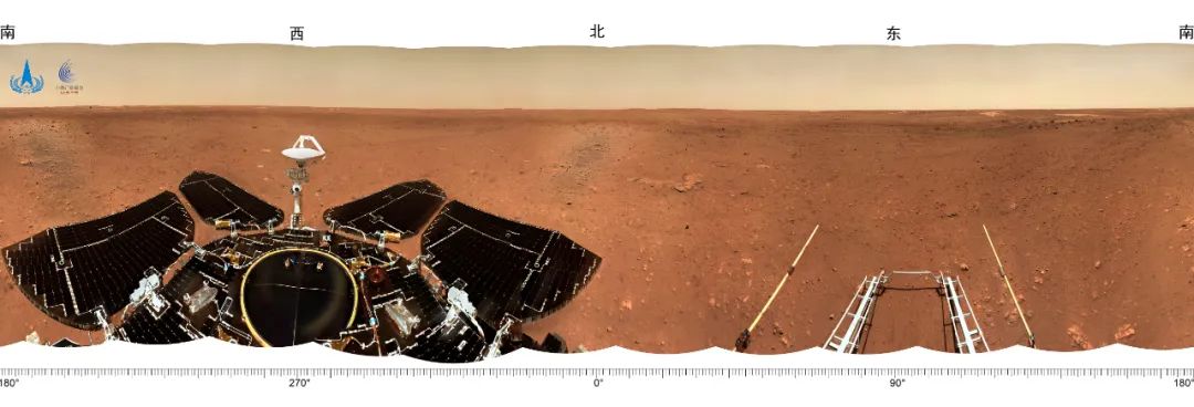 着陆点全景图,是火星车尚未驶离着陆平台时,由火星车桅杆上的导航地形相机,进行360°环拍,经过校正和镶嵌拼接而成。图像显示,着陆点附近地势平坦,远处可见火星地平线,石块丰度和尺寸与预期一致,表明着陆点自主选择和悬停避障实施效果良好。