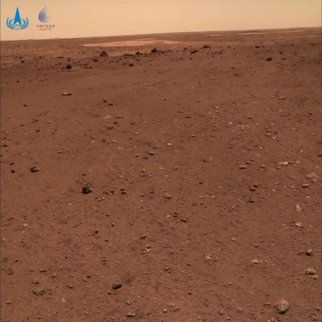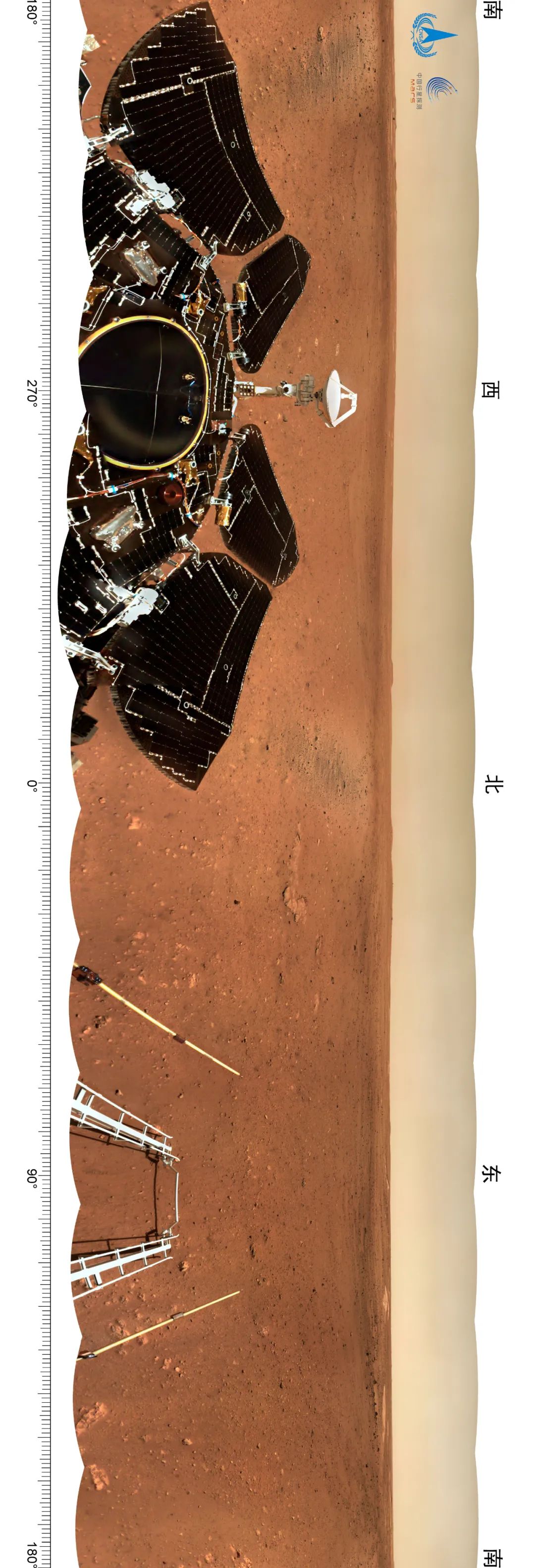 着陆点全景图,是火星车尚未驶离着陆平台时,由火星车桅杆上的导航地形相机,进行360°环拍,经过校正和镶嵌拼接而成。图像显示,着陆点附近地势平坦,远处可见火星地平线,石块丰度和尺寸与预期一致,表明着陆点自主选择和悬停避障实施效果良好。