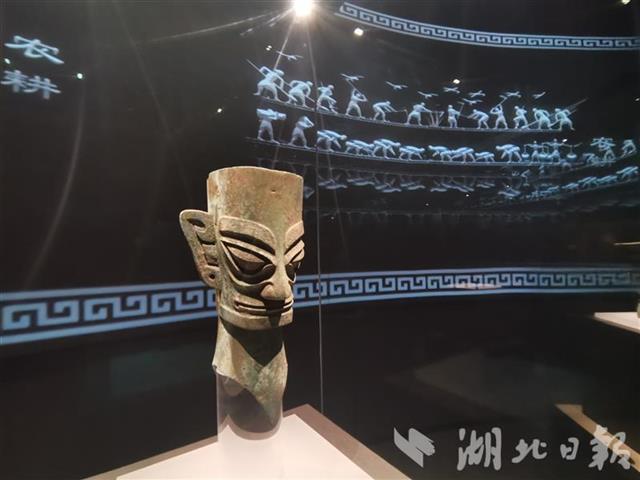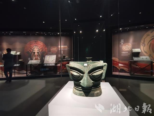 展品中出土于三星堆遗址二号祭祀坑的铜人面具,面呈方形,大眼突出,呈三角形,粗横眉,眉间额部有一个方孔,眉梢末端各有一个长方形穿孔,蒜头鼻,阔口,长耳,耳廓中空,耳垂各有一个圆孔,面具后缘下转角处各有一个方穿,眉部及眼眶用黑彩描绘,左后侧和左额有砸击痕迹。专家称,三星堆遗址青铜器这类独特造型,表现出古蜀国人神合一、政教合一的社会形态。
