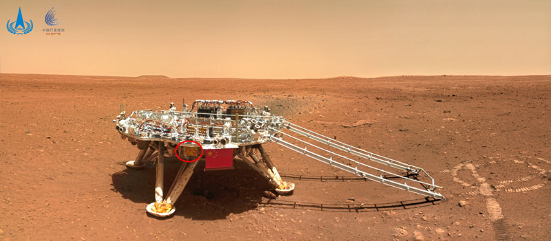“中国印迹”图,是火星车行驶到着陆平台东偏南60°方向约6米处,拍摄的着陆平台影像图。图像显示,着陆平台熠熠生辉,国旗鲜红方正,表面地貌细节丰富。