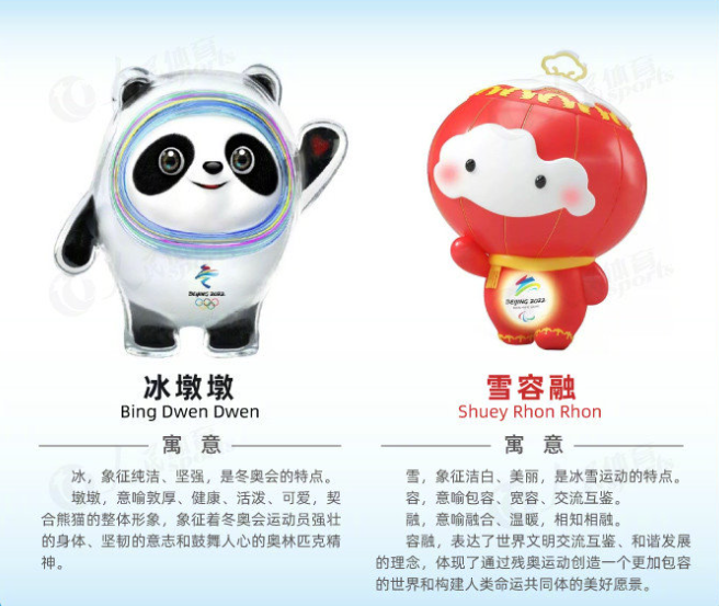 2019年9月,北京2022年冬奥会吉祥物“冰墩墩”和冬残奥会吉祥物“雪容融”正式亮相。据了解,“冰墩墩”以熊猫为原型进行设计创作,象征着冬奥会运动员强壮的身体、坚韧的意志和鼓舞人心的奥林匹克精神;“雪容融”以灯笼为原型进行设计创作,表达了世界文明交流互鉴、和谐发展的理念,体现了冬残奥运动员的拼搏精神和激励世界的冬残奥会理念。