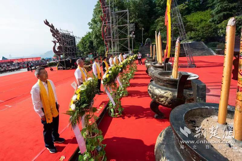 庄重、古朴的开场乐舞《英魂流芳》拉开屈原故里端午祭的序幕。号角长鸣,鼓乐阵阵,在主祭官的引领下,参加开幕式的领导缓步来到祭台前敬献花篮,整理绶带,与会的嘉宾、专家学者、艺术家代表、台湾嘉宾代表、客商代表和秭归先进典型代表上台敬献兰草,秭归屈氏后裔、民众代表上台抛洒花瓣,同时,现场大屏播放台湾彰化市民端午习俗视频,海峡两岸共祭同祖。“中华儿女,初心不忘。河清海晏,惠风和畅。五月蒲艾,驱邪迎祥。饮酒赋诗,吊古忠良。追溯高节,祖国荣光。魂兮归来,躬兮尚飨!”王永平深情颂读《颂屈原文》。全体起立祭拜屈原,祭祀结束,礼成诰舞,《岁岁端阳》的欢歌响彻平湖。