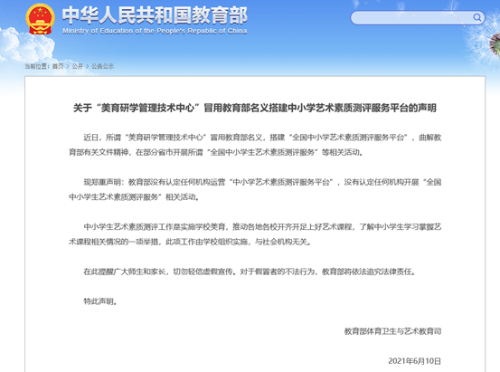 教育部郑重声明:教育部没有认定任何机构运营“中小学艺术素质测评服务平台”,没有认定任何机构开展“全国中小学生艺术素质测评服务”相关活动。