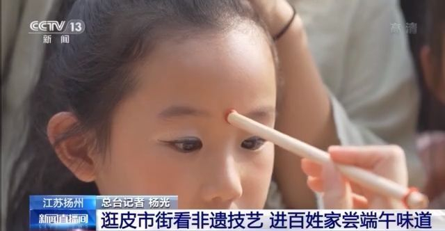 总台记者 杨光:在皮市街上也保留了许多老扬州的民俗,比如给小朋友们额头上点雄黄。端午过后各种蛇虫鼠蚁就开始活跃了,而点了雄黄可以给小朋友起到驱病避虫的一个效果。