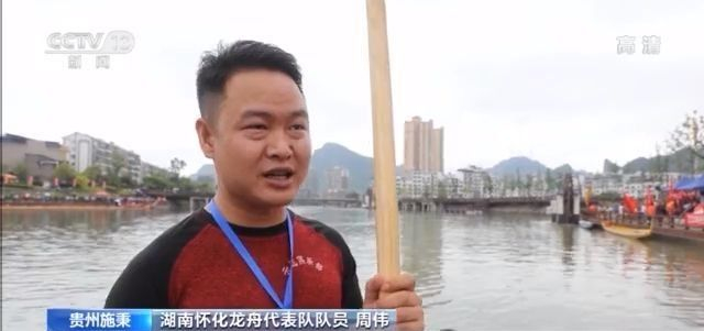 湖南怀化龙舟代表队队员 周伟:我们是湖南怀化的一支龙舟队,这次也是受到施秉县龙舟协会的邀请,来参加这一次的独木龙舟大赛。我们(当地)是采用坐姿,这边的独木龙舟是站着划的。它这个桨差不多有一米八长,我们(以前用)的桨只有一米二五。桨叶比较长,比较窄,划起来就需要用到腰部力量和腿的力量,这就是一个很大的区别。