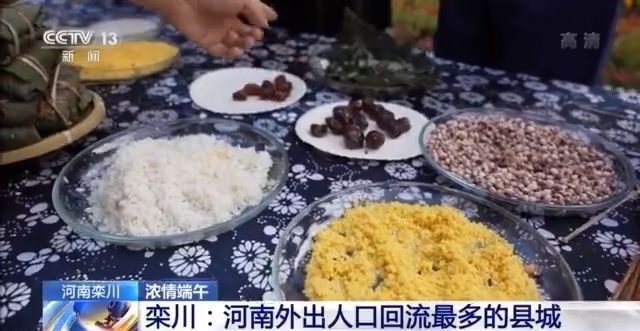 老乡告诉我们,这个黄色的就是包槲包最传统的馅料,它不是小米,它的名字叫秫米。党的十八大以来,当地开始依托独有的山水资源,通过大力发展旅游来促进乡村振兴,旅游收入也是逐年攀升。整个栾川,有三分之一以上的人都从事着和旅游相关的产业。栾川也成了整个河南外出人口回流最多的县城。人们的钱袋子越来越鼓,槲包的食材也越来越丰富。现在除了传统的秫米,还有豇豆、蜜枣、糯米,还有赤小豆等等。包好的槲包是成双成对扎到一起的,寓意好事成双。您别小看这小小的槲包,现在借助电商平台,它走向了全国各地。光是一个端午节,它的收入就能超过四五百万。