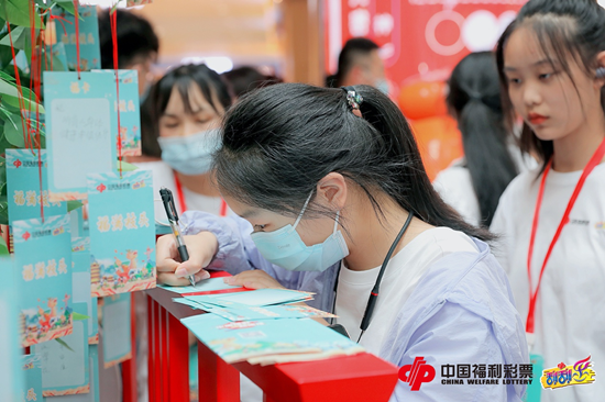 “福满枝头”游戏区相对安静一些,参与观众在这里提笔写下对福彩公益事业和福彩“扶老、助残、救孤、济困”公益受助对象的真挚祝福,认真而庄重。