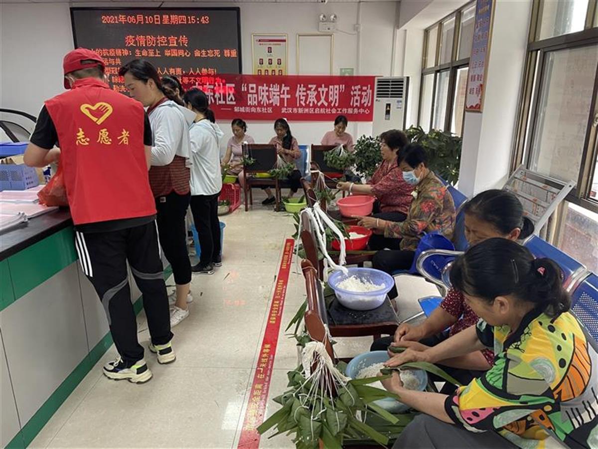 “五月五,是端阳。门插艾,香满堂。吃粽子,撒白糖,龙舟下水喜洋洋。”为营造邻里和睦、团结互助、和谐友爱的社区氛围,新洲启航社工和邾城街道、社区社工站、社区居家养老服务中心等社工服务项目,结合“文化传承”“党史教育”“邻里互助”“志愿帮扶”等主题,组织多个社区开展形式多样的端午节系列服务活动6场次,500余名社区居民现场就近参与,间接服务人群1200余人次。在社工精心组织下,营造浓情端午氛围,为辖区居民带来了“有温度、有情怀”的社会工作服务。