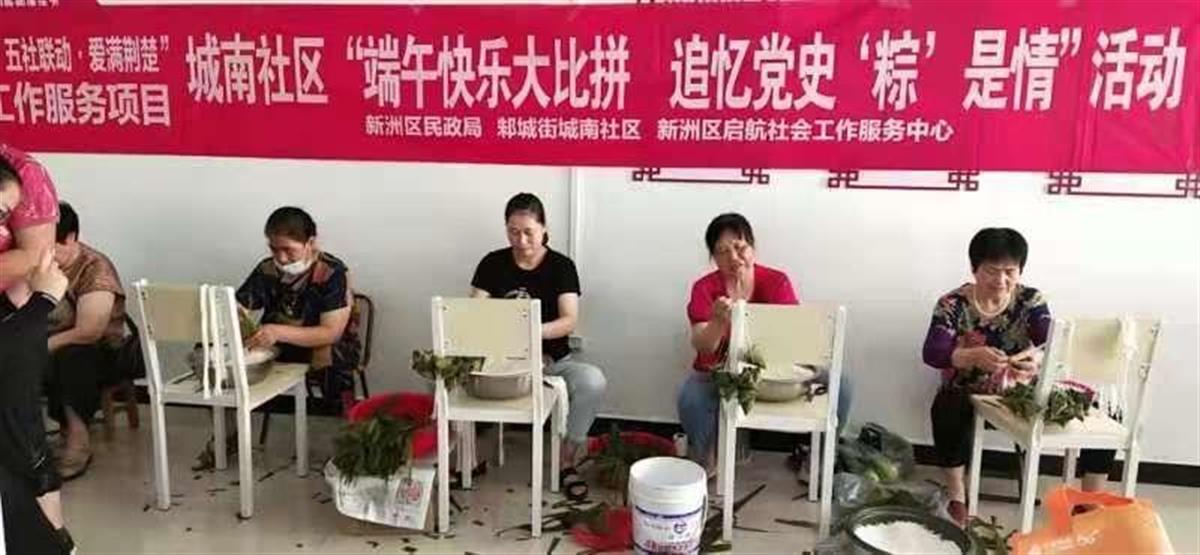 2021 年6月9日上午,在新洲区民政局的指导下,新洲区邾城街城南社区“腾讯公益·五社联动·爱满荆楚”社会工作服务项目组联合城南社区,以党史学习教育为契机,组织辖区居民和党员志愿者在社区图书馆开展“端午快乐大比拼 追忆党史‘粽’是情”为主题的端午节包粽子比赛活动,从活动中感受传统文化的魅力,致敬革命先辈,增强文化自信。