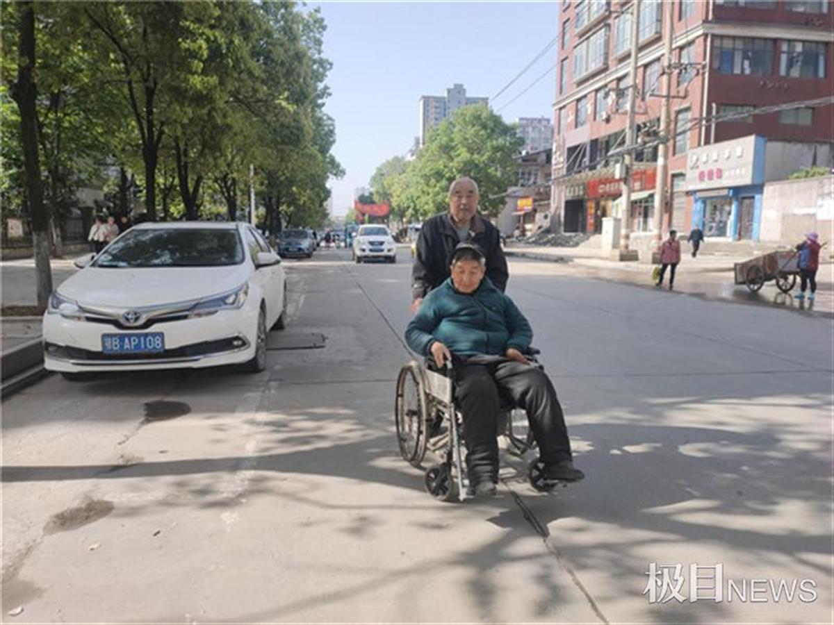 6月14日上午,天气燥热,行走在陆家铺社区汪家湾小区内,老远看到头发花白的汪贤商,正努力推着轮椅,轮椅上坐着的是他的老伴黄相英。