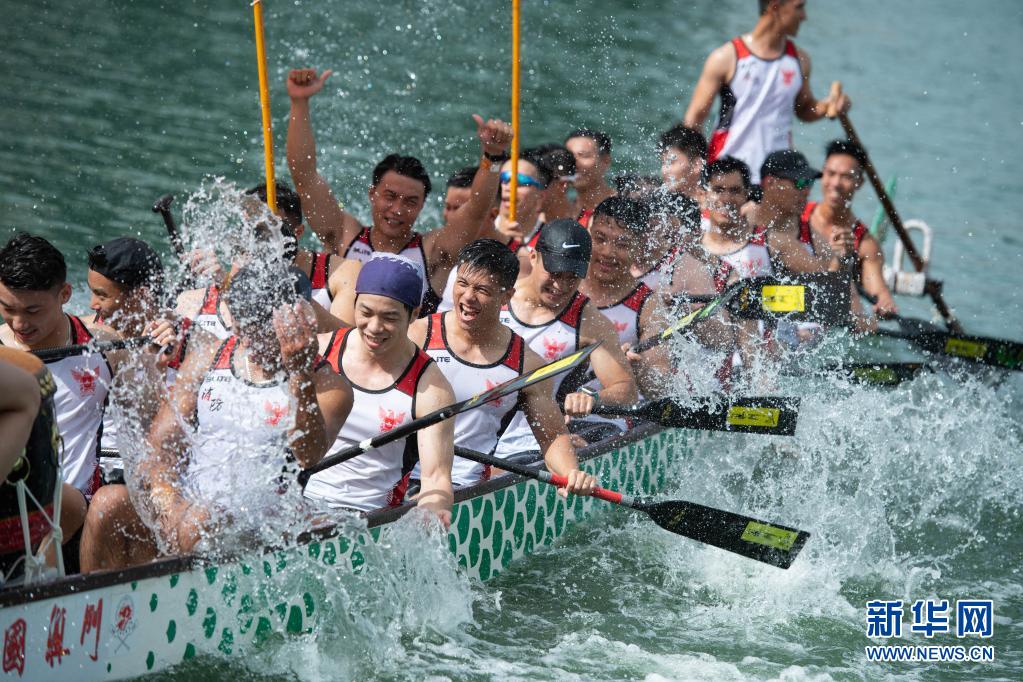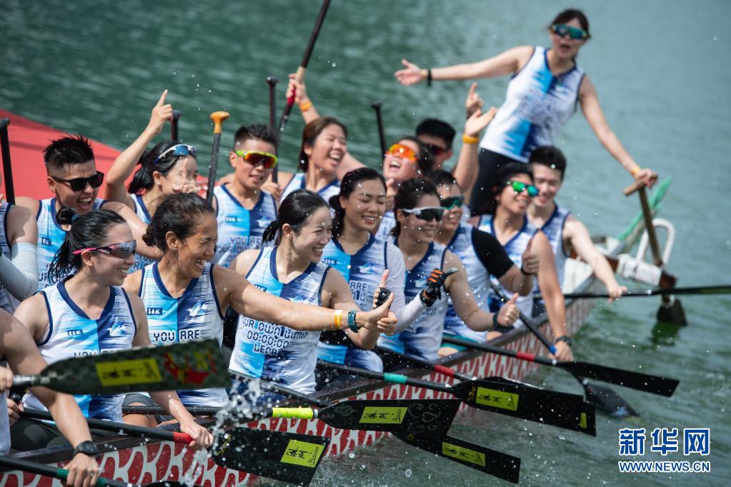 6月14日,澳门青少年发展协会龙舟队在标准龙500米女子组比赛后庆祝。