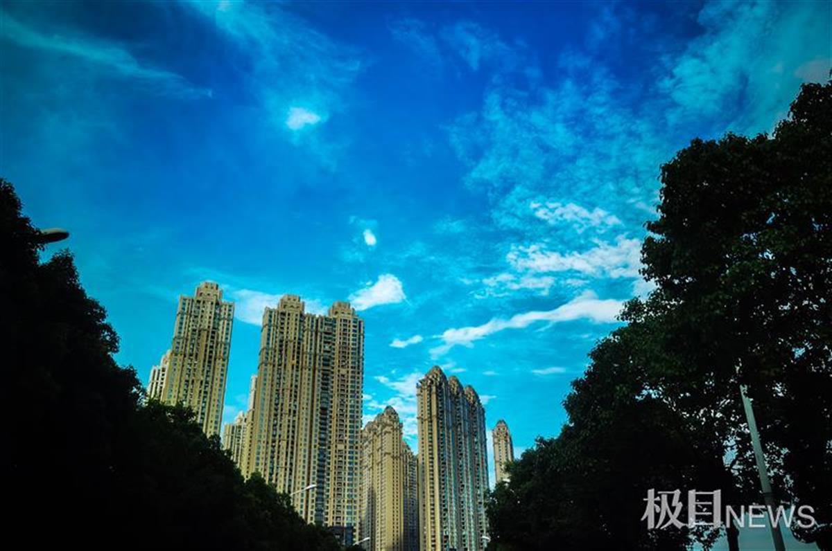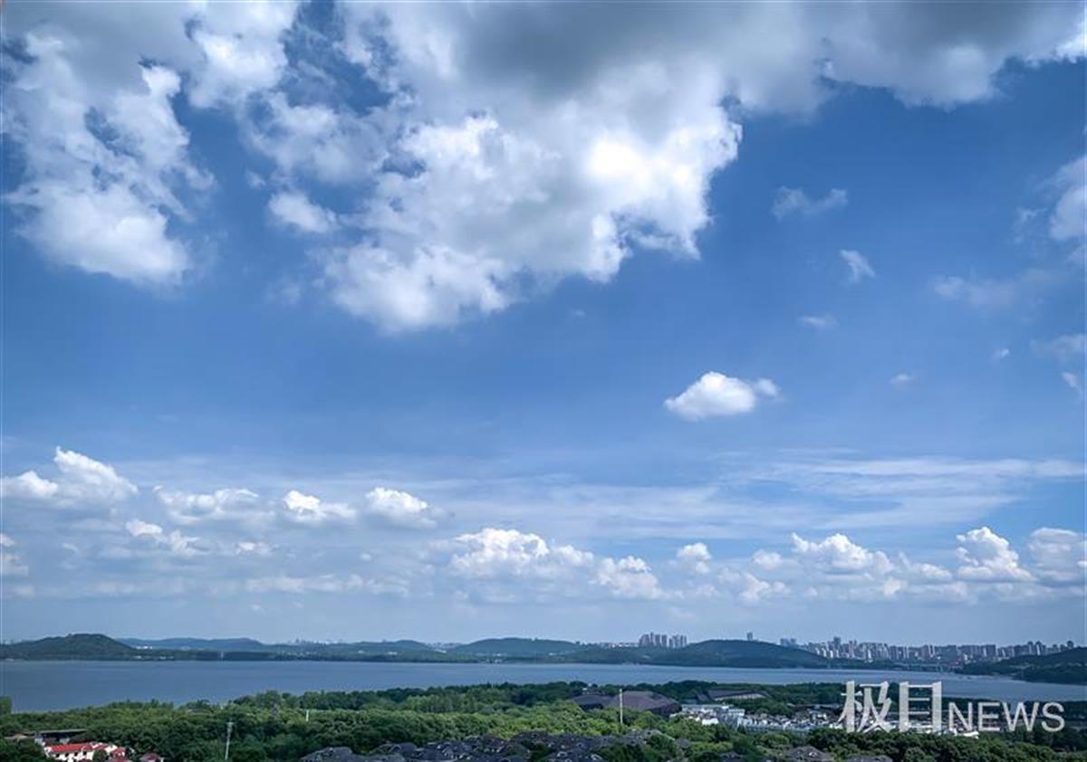 15日武汉天空湛蓝通透,蓝天里朵朵白云象“棉花”一样飘在空中,纯净的蓝、奶油的白,凉风习习令人心旷神怡。