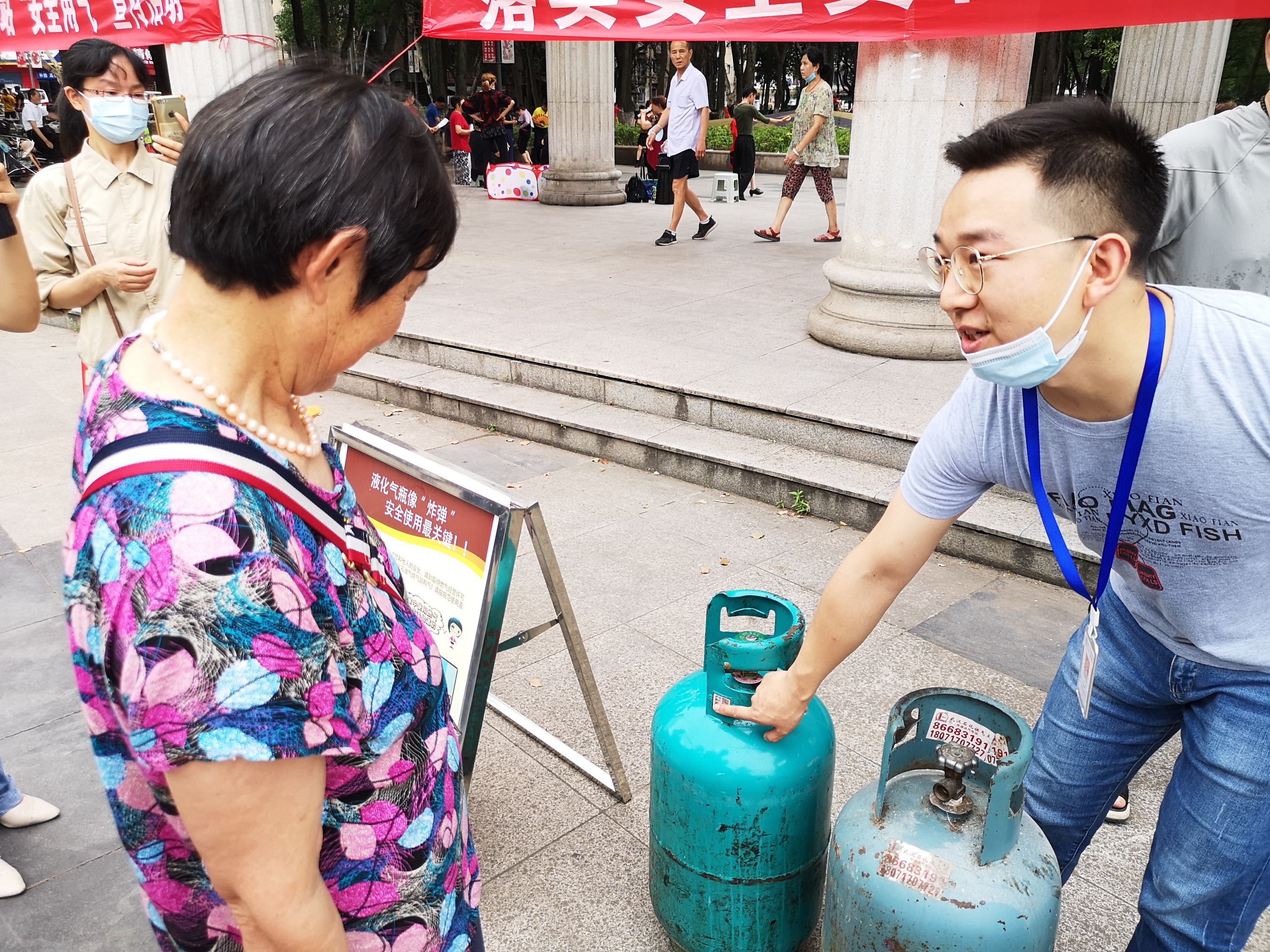 张旭坤(右)正在给居民讲解燃气钢瓶的使用。 长江日报记者覃柳玮 摄