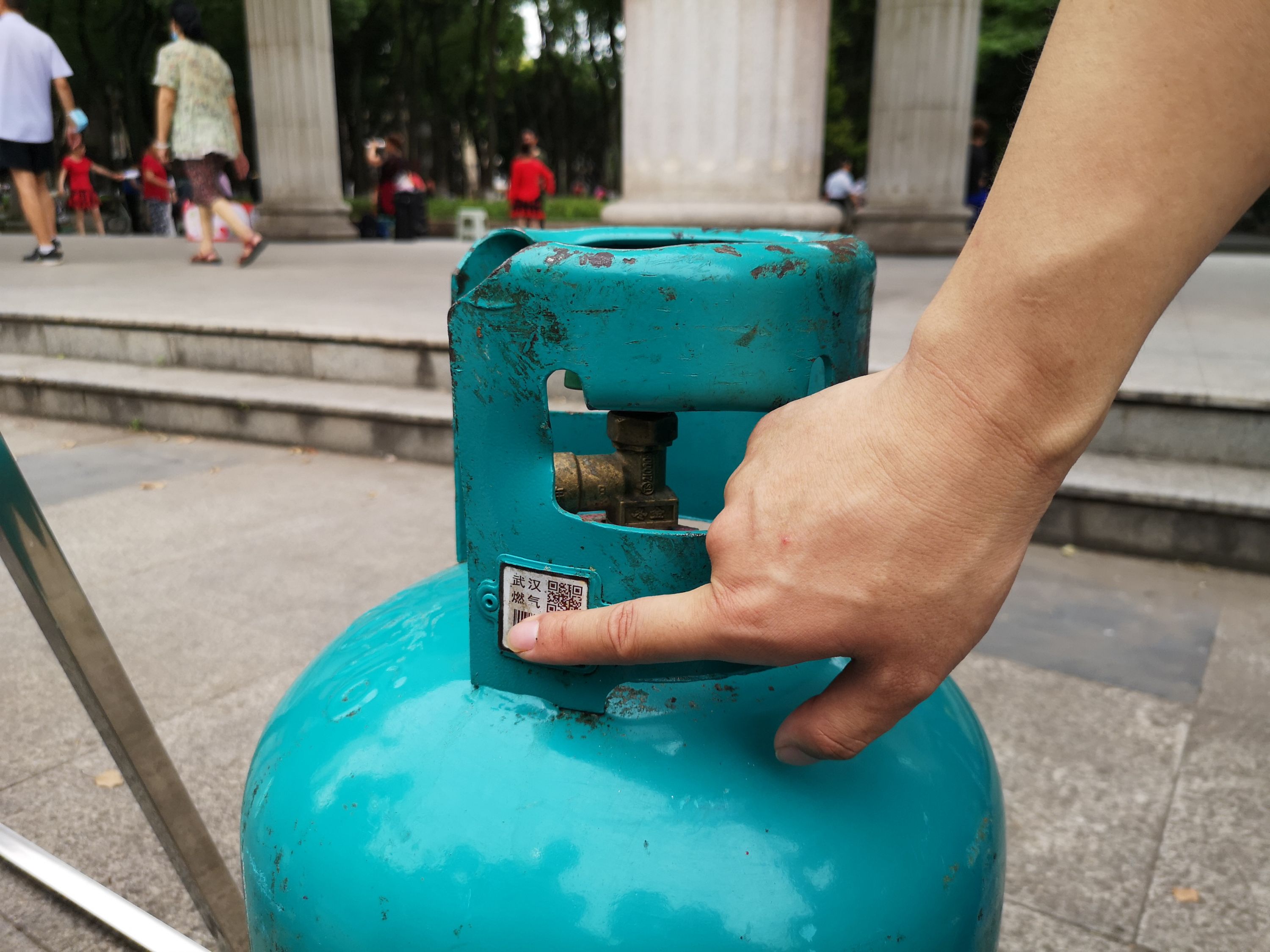 每一个合格的燃气钢瓶在抓手处都有一个二维码和条形码。 长江日报记者覃柳玮 摄