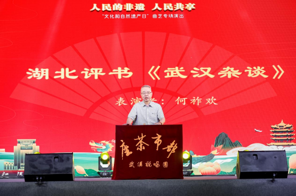 “人民的非遗 人民共享”文化和自然遗产日曲艺专场演出由武汉说唱团、江汉大学人文学院和武汉市群众艺术馆联合举办,江汉大学湖北省非物质文化遗产研究中心承办。演出现场大咖云集,何祚欢、张明智、陆鸣、田克兢等武汉曲艺名人纷纷登台,湖北评书、湖北大鼓、湖北小曲、快板、相声、单弦拉戏等一批非遗传承项目依次登台亮相。