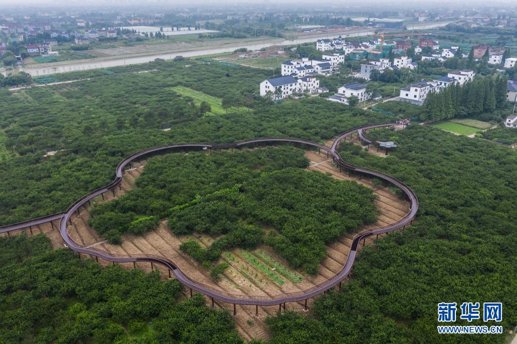 6月16日,空中俯瞰桃园村的槜李园,果园内新建成的栈道方便游客观赏乡村美景(无人机照片)。