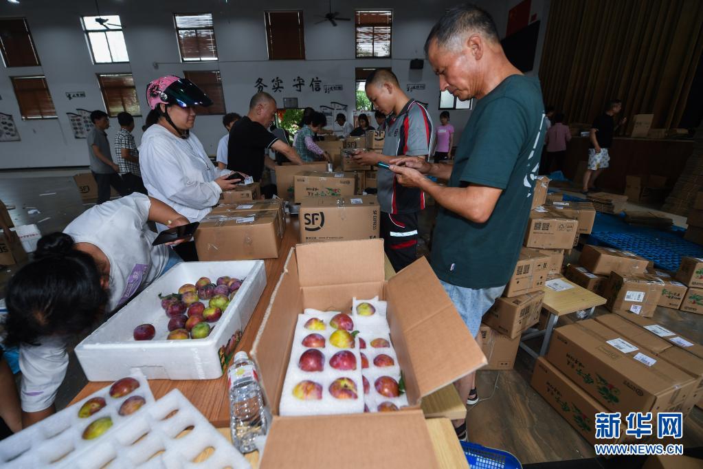 6月16日,桃园村的果农在村里的物流集散中心将采摘下来的槜李打包发货。