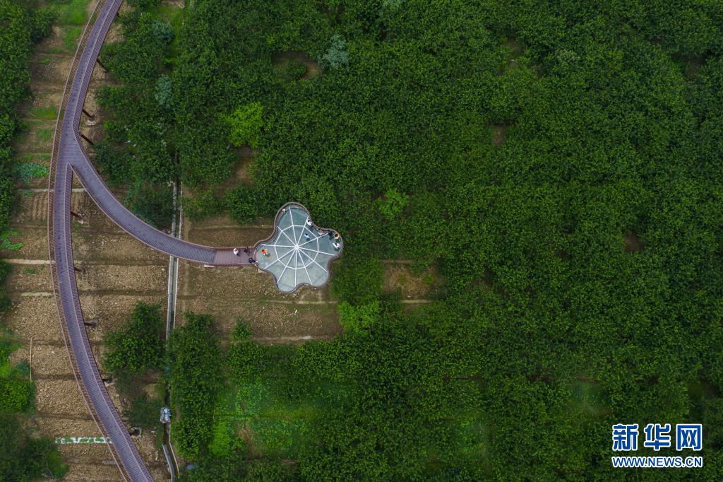 6月16日,游客在桃园村槜李园中新建成的栈道上观赏乡村美景(无人机照片)。