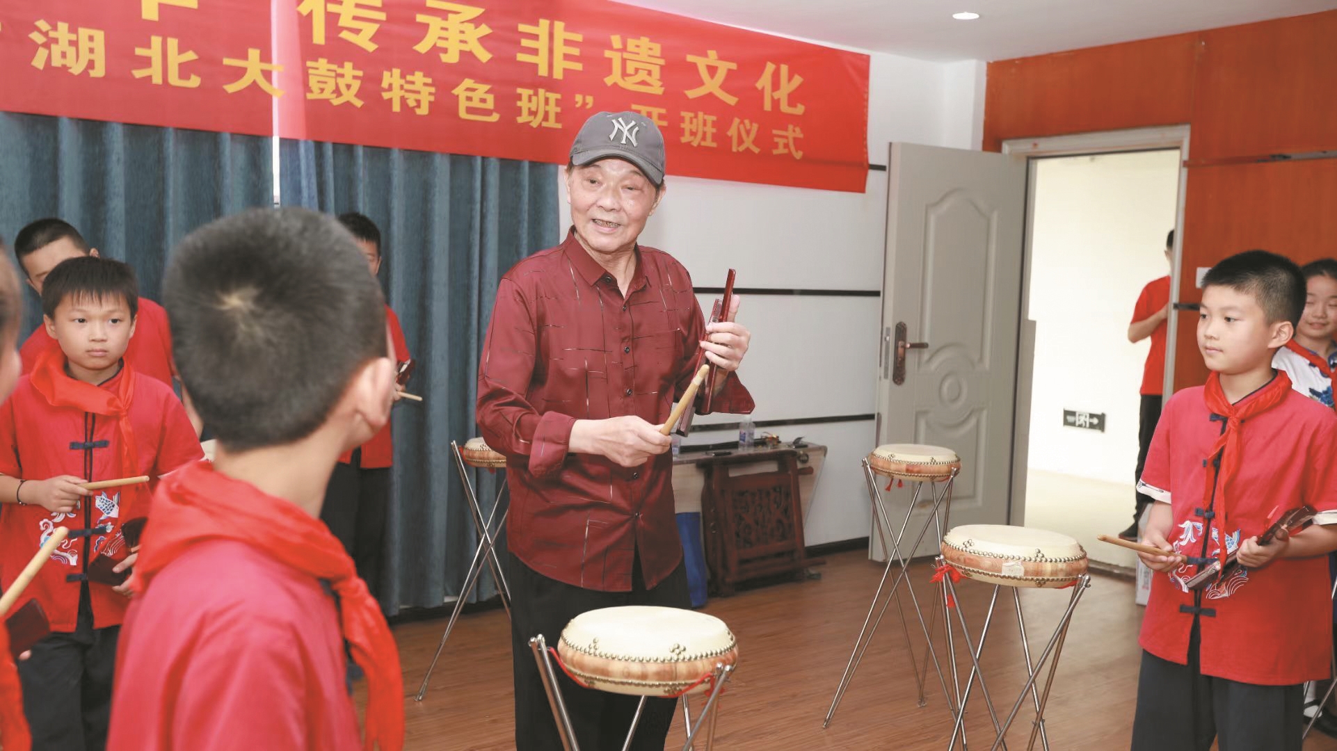 这是该校根据国家级非物质文化遗产名录中的湖北大鼓开设的湖北大鼓特色班,也是全国首个湖北大鼓特色班。开班仪式上,12位学员右手持鼓签,左手持云板,热情洋溢地用黄陂方言表演精彩曲目《党的光辉记心怀》,湖北大鼓国家级非遗传承人张明智携弟子现场传艺(如图)。