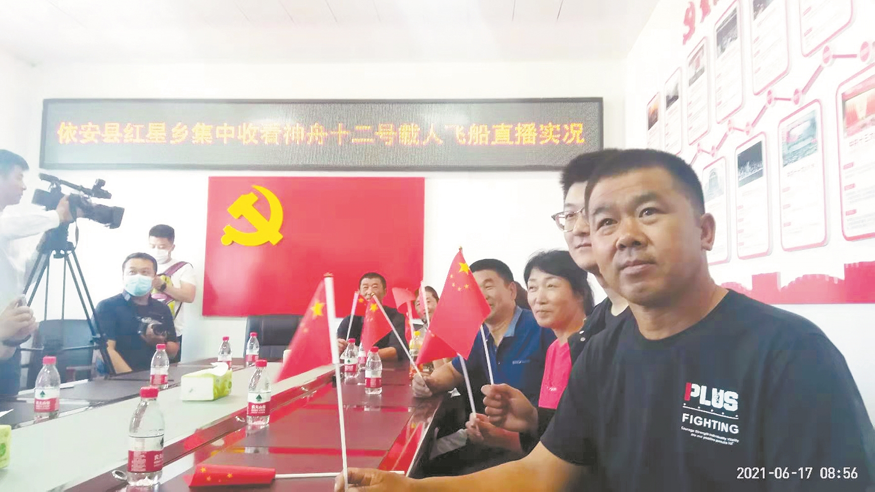 昨日神舟十二号发射升空时,在航天员刘伯明的老家——黑龙江省齐齐哈尔市依安县红星乡,大哥刘伯真、弟弟刘伯福等一众亲属,被请到红星乡政府的会议室一起观看飞船发射升空的电视直播,为刘伯明等加油祝福。
