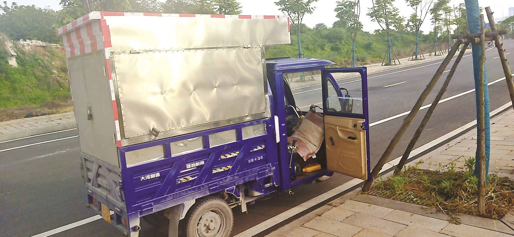经过2天时间,花了800元的材料费,一辆电动三轮车就摇身一变,成了吃住行俱全的“房车”。