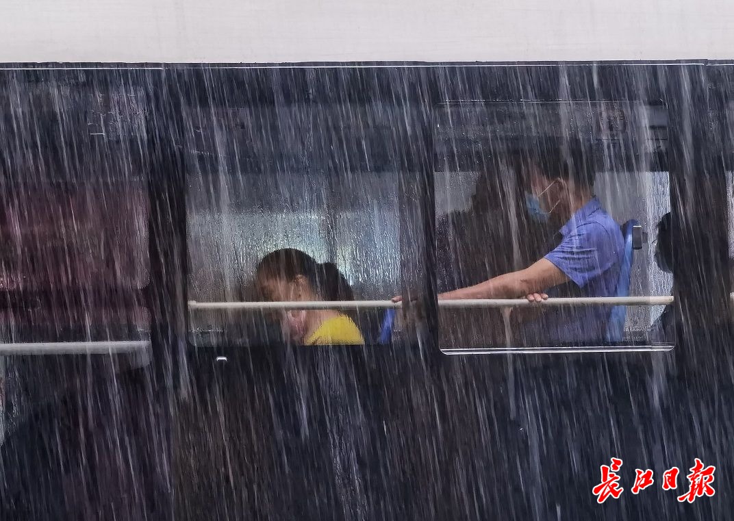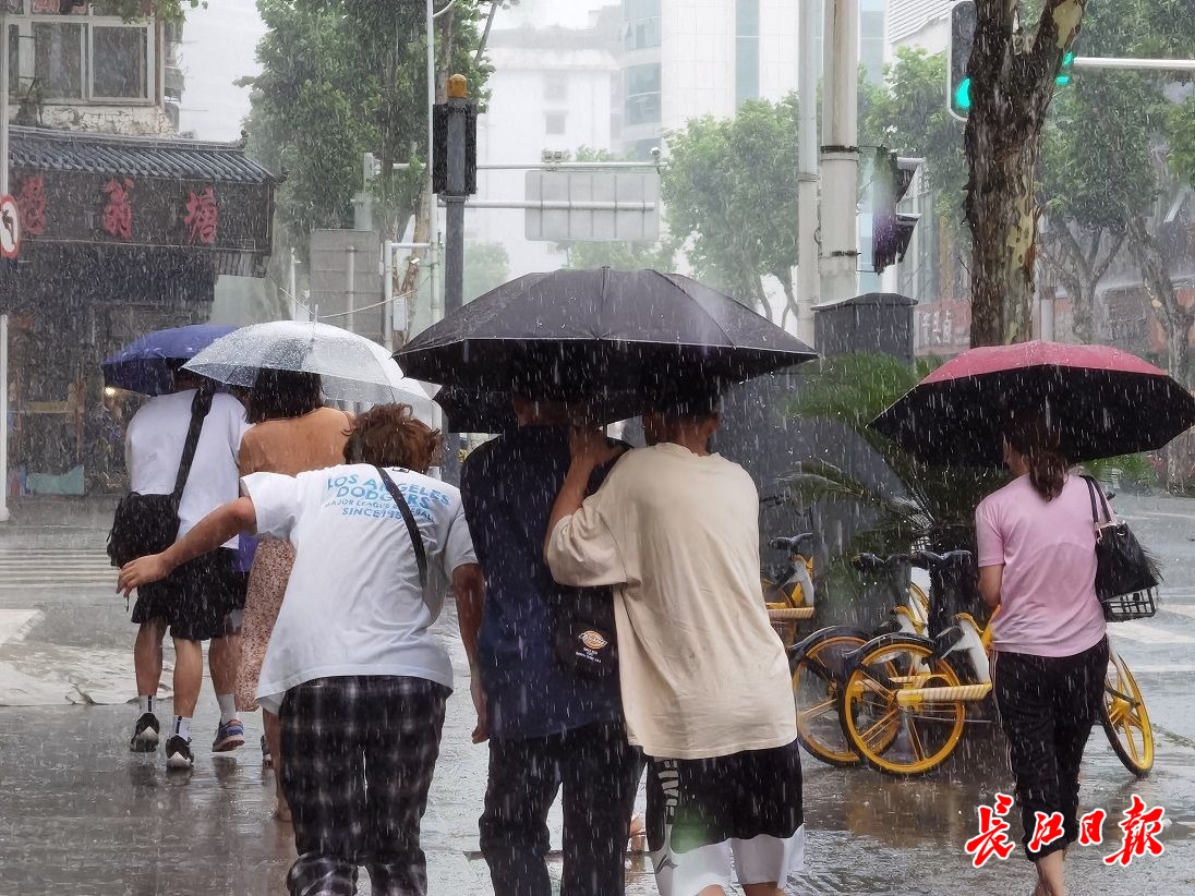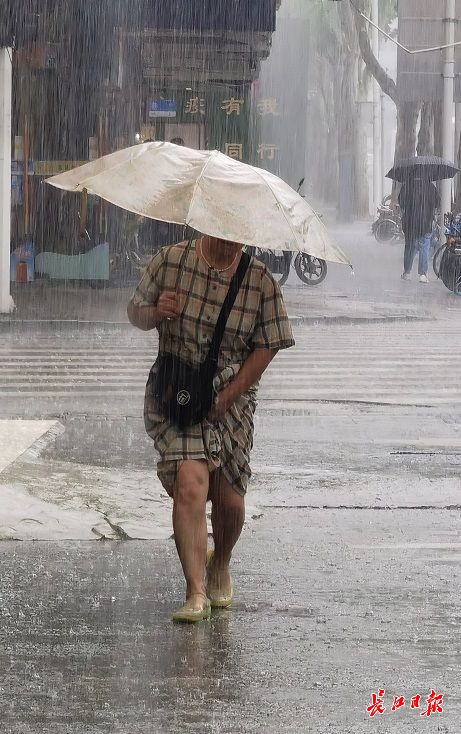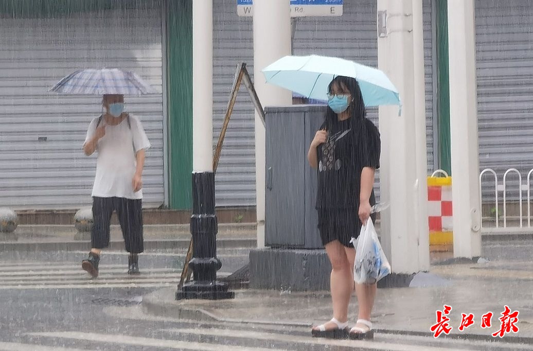 6月18日上午9点多钟,一场突如其来的大雨如同雨幕一般泼向地面,记者在武昌解放路看到,市民冒雨出行。