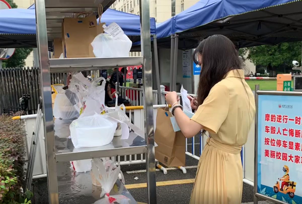 6月18日中午,在武汉音乐学院靠长江边的校门口,前来送快餐的骑手小哥们络绎不绝,走出校门口取快餐盒饭的学生也一波又一波。记者发现,快递骑手们均把快餐盒饭放在校门口一个金属铁架子上,学生出来只需在架子上寻找目标盒饭即可。