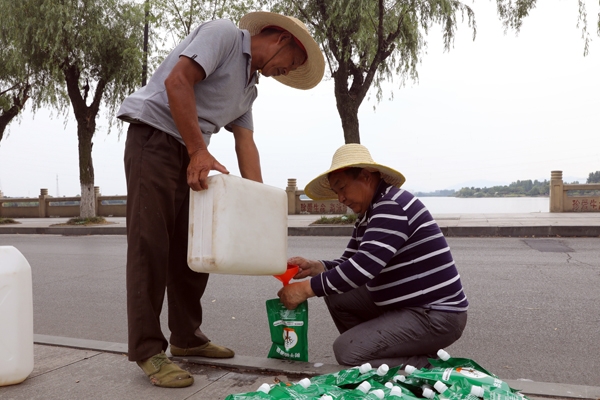 园林工人赵祖贵介绍,“这种药对树防治病虫害有很大的帮助,打到树里渗透后,树里面的虫就会死掉,外边的虫闻到气味后会自然跑掉。”