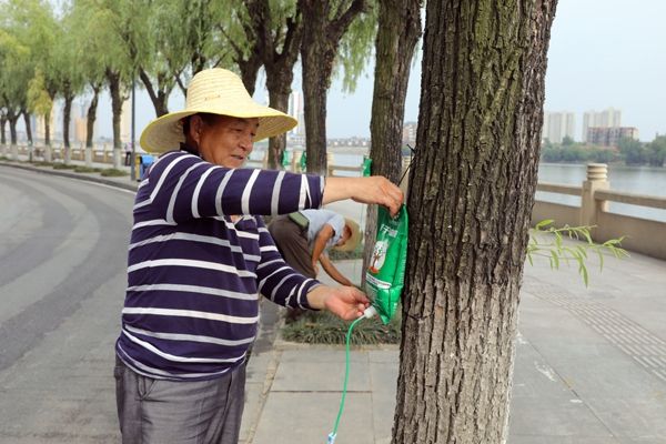 园林技术员王婷婷说:“情侣路的金丝柳因“天牛”危害,造成不少树木树杆蛀空,树枝折断。现在正是天牛危害高发期,将农药和水按一定比例稀释后注入树体,既不污染环境,也十分有效。”