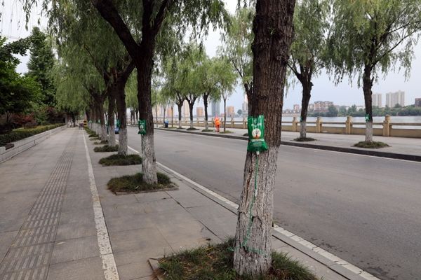 本网讯记者李勤 周波通讯员叶忠云报道:人患病需要“挂吊瓶”,大家都习以为常,近年来,树木生病了,同样要用“挂吊瓶”来防治。近日,在宜城市情侣路,1050棵金丝垂柳树树干上都挂着一个个装有液体的袋子,打起了“点滴”,液体顺着导管一滴一滴输入树木体内。