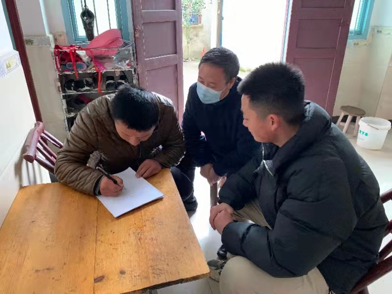 驻村工作队员上门通过笔和纸与何文(左)沟通。通讯员供图