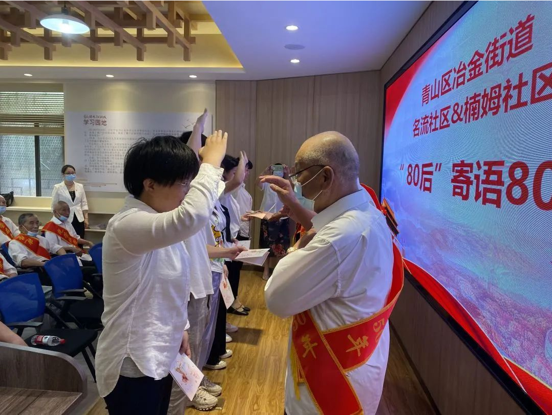 名流社区颁发会场设置了80岁老党员寄语“80后”青年环节,来自辖区的党员、入党积极分子与老党员们面对面交流,聆听老党员们的谆谆教导,共同回忆入党初心。