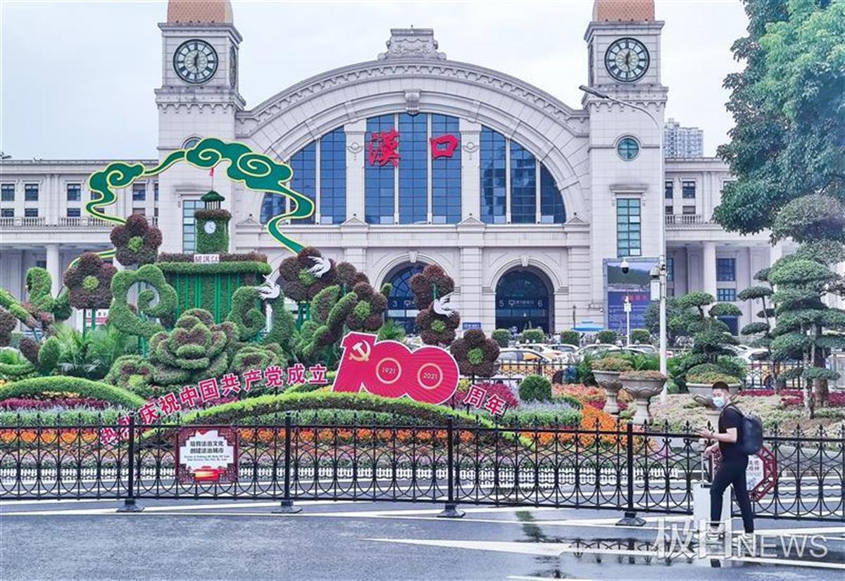 6月18日,庆祝建党100周年主题立体花坛,呈现在汉口火车站站前广场。吸引了市民和南来北往的游客驻足观赏。