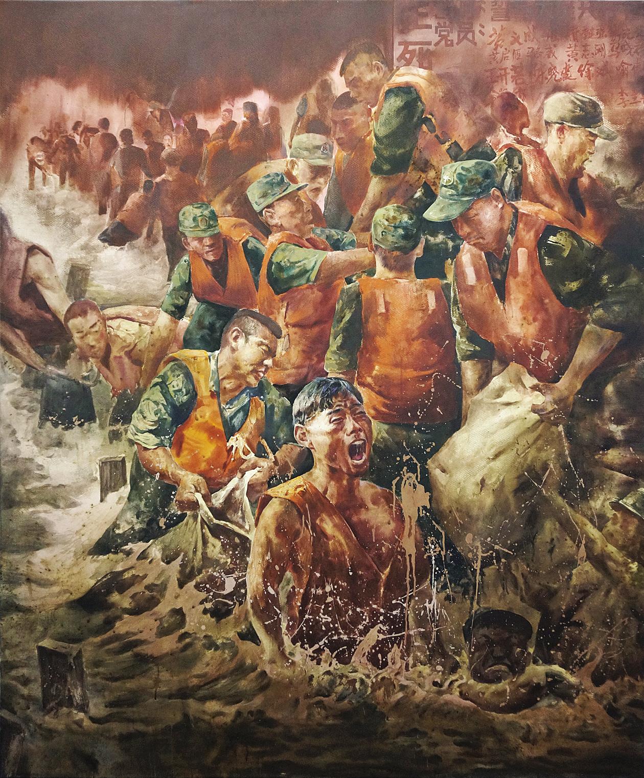 林波的水彩作品《誓与大堤共存亡》,围绕1998年抗洪16位党员立“生死牌”誓与大堤共存亡的事件展开,讴歌共产党人的英勇壮举。肖丰、吴青的油画《穿过黑暗的那道光——武汉庚子年春》,以武汉抗击新冠疫情为主题,用纪实的方式赞美救死扶伤的医生就像身穿白衣铠甲的勇士。